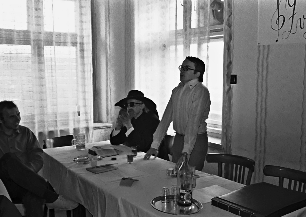 Karola Duchoně, jenž tenkrát asi ještě netušil, že se propíjí ke smrtelné cirrhóze. Pila se borovička v množství větším než malém.