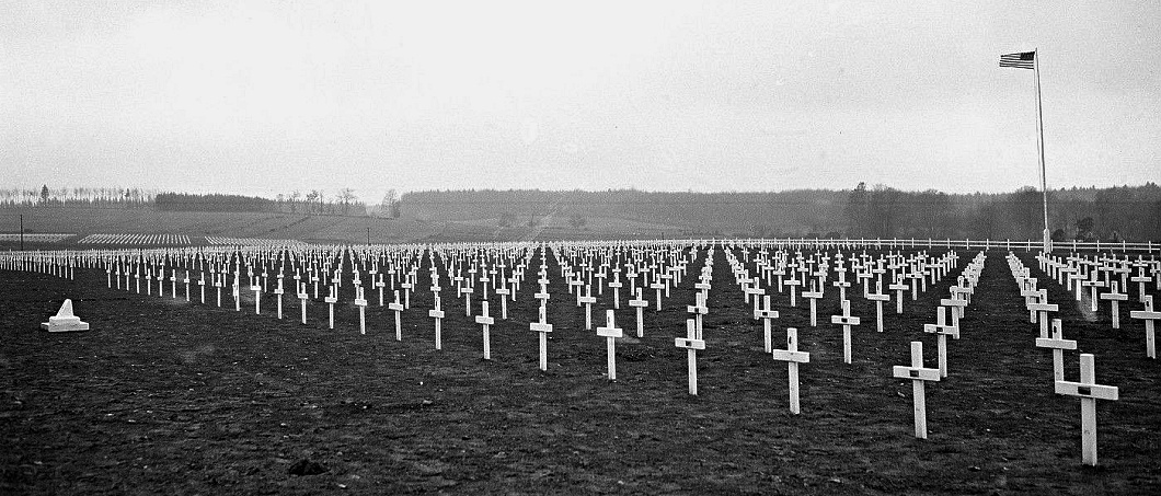 Hřbitov u Bastogne v Belgii, 25. listopadu 1945. Hroby Američanů padlých v bitvě v Ardenách.