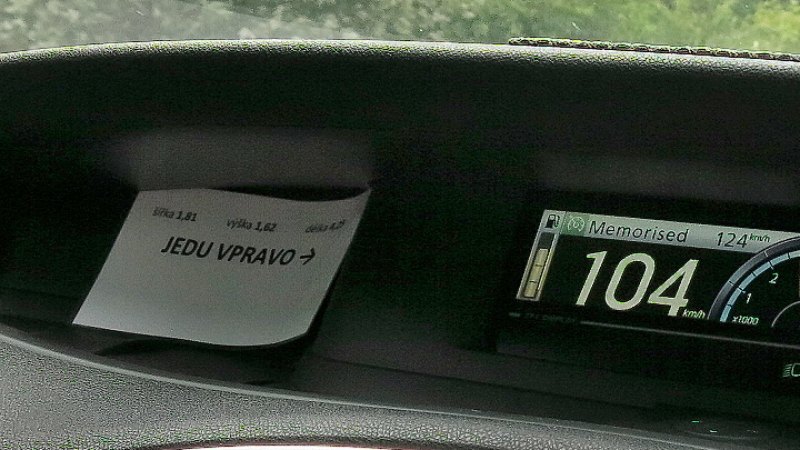 Věra si to ještě vylepšila, nainstalovala si na přístrojovou desku cedulku, kterou před vyjetím z trajektu vždy otočí.