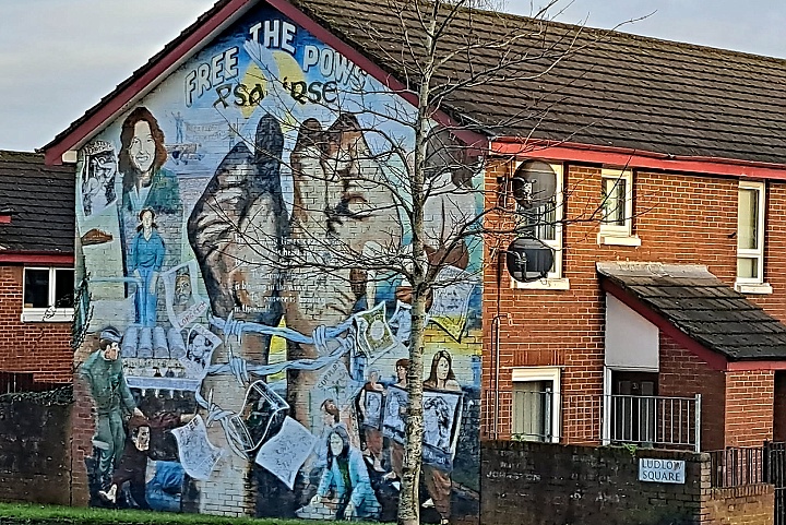 cedulí a murálů, věnovaných památce lidí, kteří byli zastřeleni během nepokojů v sedmdesátých a osmdesátých letech.