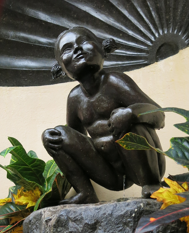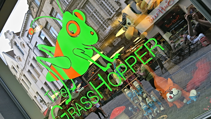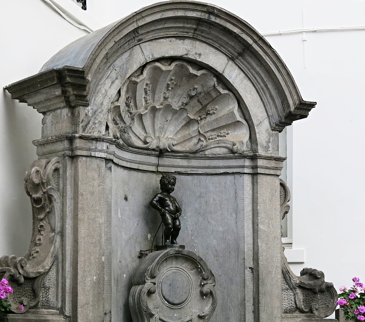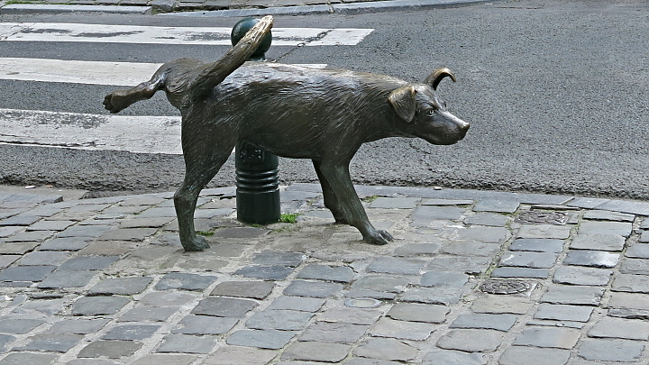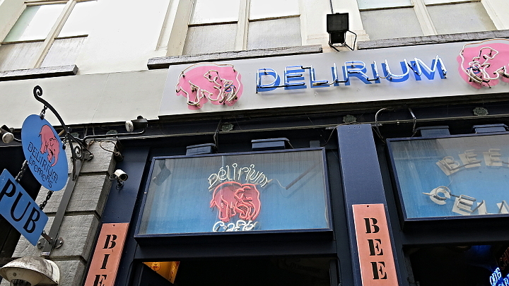 Čůrající holčička, chlapeček a pes jsou proloženi pivaři vyhledávaným podnikem Delirium (2000 druhů piv).