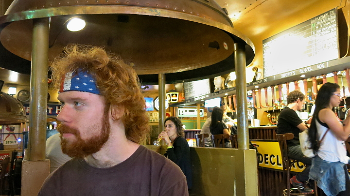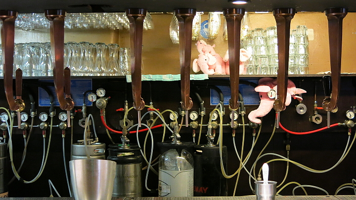 Dodávám jenom, že Allan se točí k pivu zády (jest nepijákem) a já si můžu, jako bývalý piják, takovéto interiéry jenom pasivně prohlížet. V Belgii prý opilci nevidí bílé myši, ale růžové slony.
