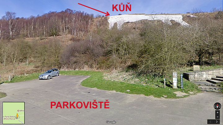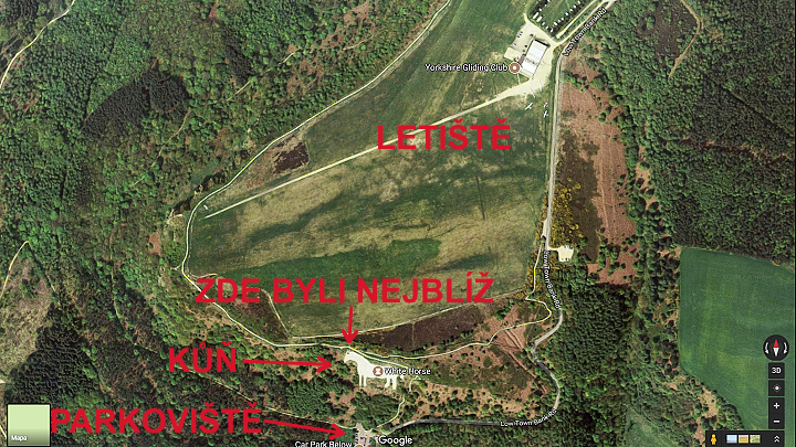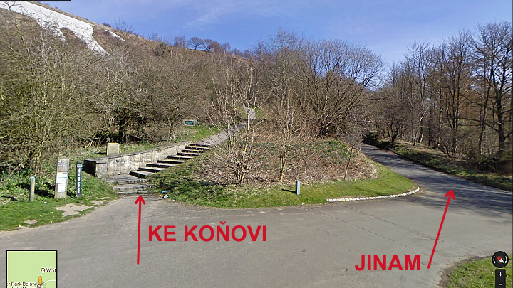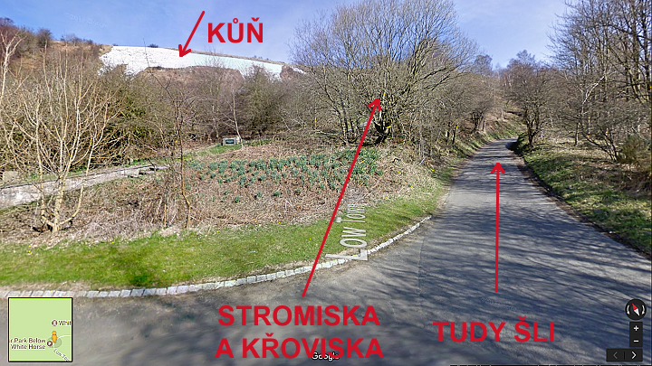 Toto jsou ovšem pohledy, které jsem viděl já, chodící s panáčkem po googlemapě v počítači. V&A měli koně přímo nad sebou, ale nemohli ho vidět přes křoviska a stromy. Byl srpen, všechno olistěné a neprůhledné. A tak cupitali po dlouhé cestě a kůň pořád nikde.