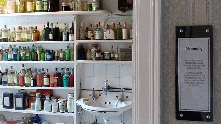 Wight-Herriot právě někam odskočil. Léky jsou připraveny v regálech, pomůcky nachystány, návštěvní kniha čeká na další zápis.