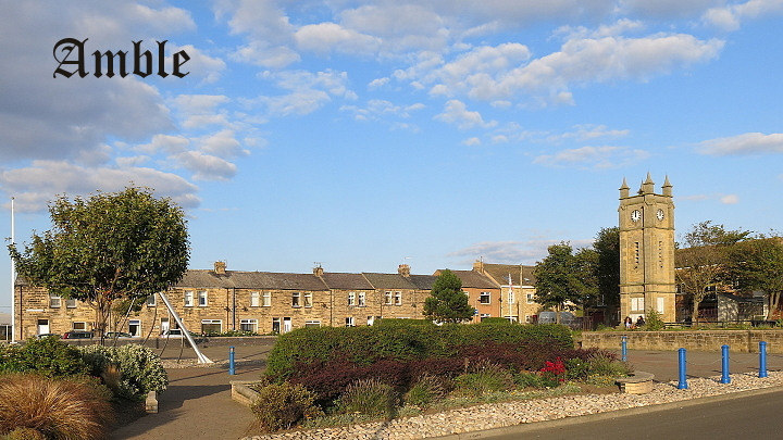 Amble: klidné moře, upravené záhony, nezbytná zvonice, typická ulice.