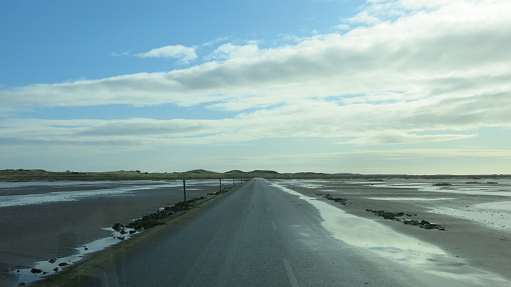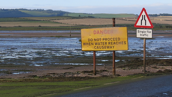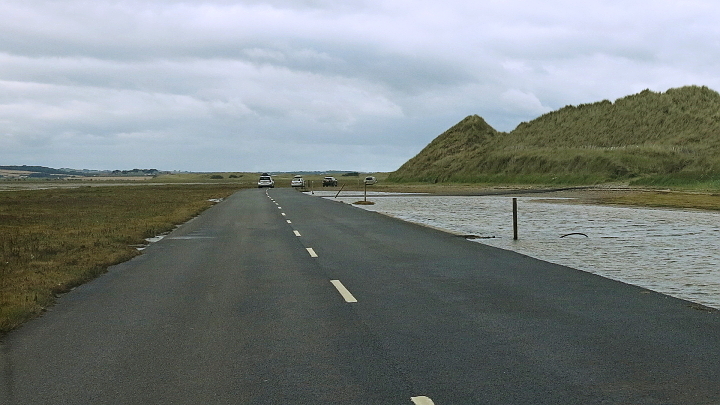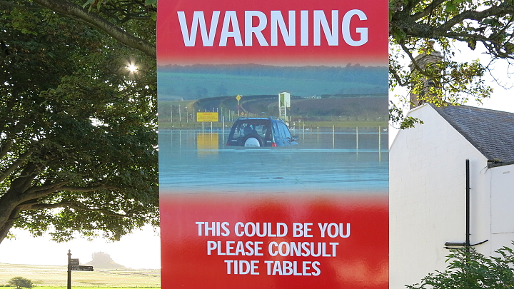 Holy Island, je přílivový ostrov. V&A na ostrov dorazili včas, výstražné cedule mohli beze strachu minout.