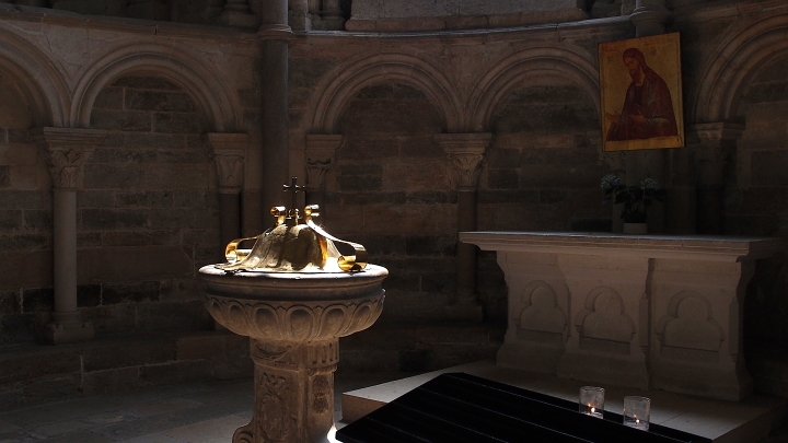 Ještě tři zajímavosti: krásná křtitelnice, pečlivá novicka, která pomocí distančního špalíčku na dlouhé násadě rovná židle do přesných rozestupů, a dřevěná socha, kterou klášteru patrně věnoval jakýsi