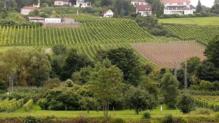 Všude vinice, do kterých lze bez překážek vstoupit. Na protějším břehu jsou vinice německé, mnohem menší, rozparcelované na kousky. Asi odmítají kolektivizaci. :o)