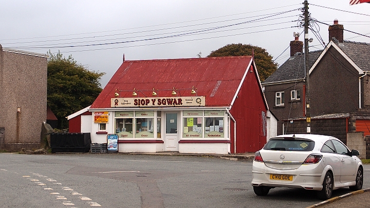 Maenclochog, v ní krásný kostel a rozkošný obchod. Málokterý nápis byl v angličtině.