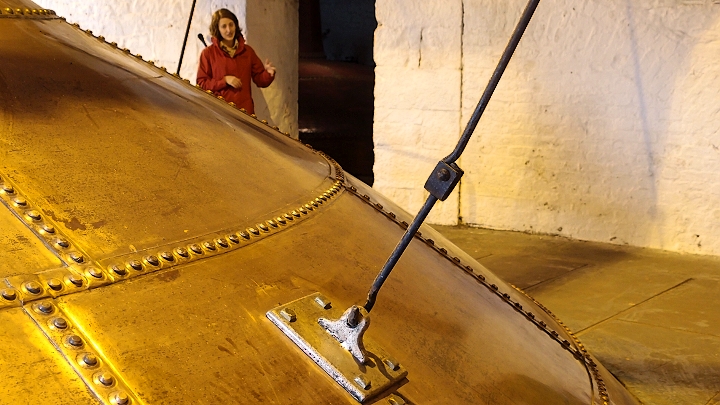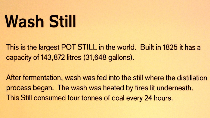 Podívejme se ale na pár krásných kuriozit! Všechny stroje, míchačky a mlýny pohánělo původně obrovité litinové vodní kolo. Největší kotlíkový destilační přístroj na světě (objem skoro 144 tisíc litrů):