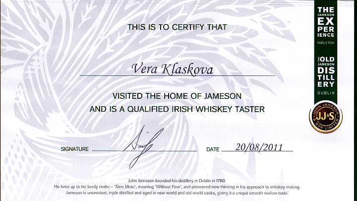 Byli jsme vybídnuti k dopití, i učinili jsme tak. Dotázali se, jak máme whisku nejradši. Ostatní účastníci se předháněli v šílenostech, jako že s džusem, tomatovou šťávou (!) a podobně. Věra a já jsme jediní jako jeden muž prohlásili, že jedině čistou a bez ledu. A udělali jsme zase dobře. Paní průvodkyně uznale pokývala hlavou, asi jsme jí udělali radost. Pak nechala každému přinést whisku v úpravě, ke které se hlásil. Takže ostatním donesli sklenice s různobarevnými podivnostmi a nám každému óbrpanáka čistého jamesona. A na závěr nás obdarovali úžasnými diplomy: