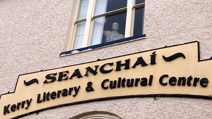 Bryan MacMahon (1909 - 1998), učitel, folklorista, majitel knihkupectví, básník, autor balad a povídek, dramatik a producent her, překladatel. Štátuje jsou v životní velikosti, můžete se jim postavit tváří v tvář. Pan Keane jde dokonce přímo proti vám po chodníku. Další neznámý velikán na nás shlížel skrze okno místního kulturního centra.