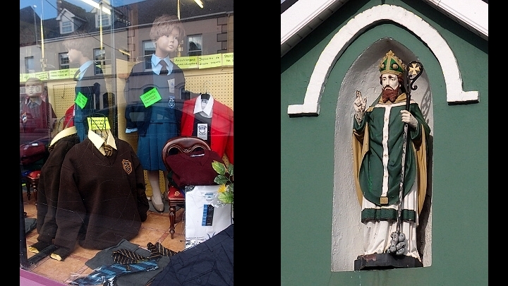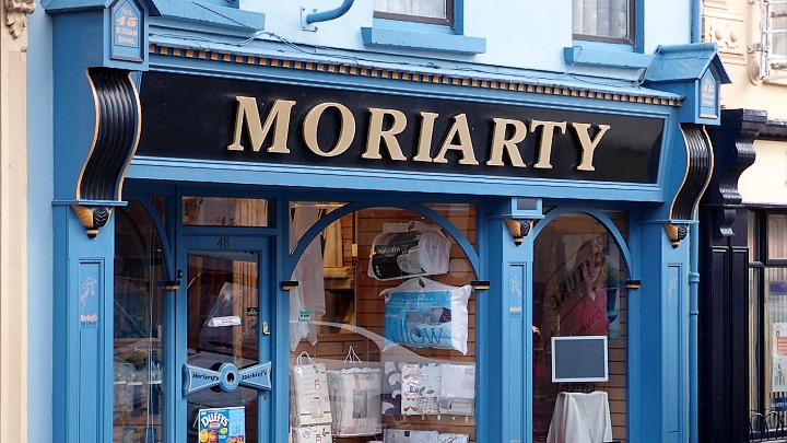 A ještě vám nabídnu pár věcí, které nás zaujaly: zvláštní pomník řádu Sester Obětování blahoslavené Panny Marie, další ukázka Ukřižování (tentokrát barevná), výloha plná školních uniforem (škola v Irsku tenkrát právě začala), pěkně vybarvený svatý Patrick ve štítu domu, typické komíny, které jsou v Irsku, podobně jako v Británii, všude; a nakonec krám, jehož majitel nese velmi profláknuté jméno Holmesova největšího protivníka.
