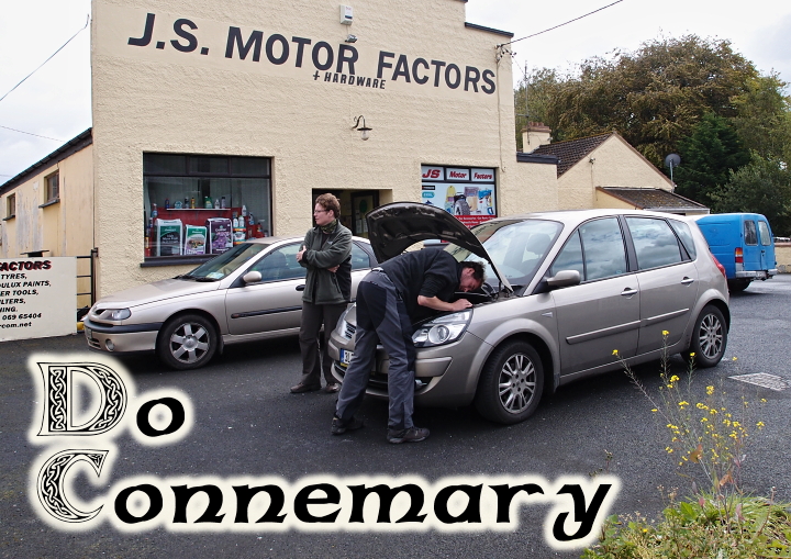 Galway. Samozřejmě, bez komplikací to nejde: autu odešlo pro změnu levé očičko. Žárovky měly patrně doslouženo. Kde sehnat v sobotu rezervní? Jak vidíte, žádný problém. Na předměstí