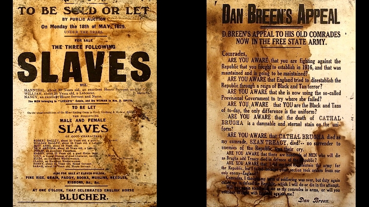 První dvojice je jasná: vlevo irský odboj, vpravo oranžistická reakce. Dole: Dražba otroků pod třemi stromy v roce 1829, vpravo známý revolucionář