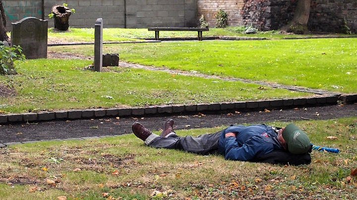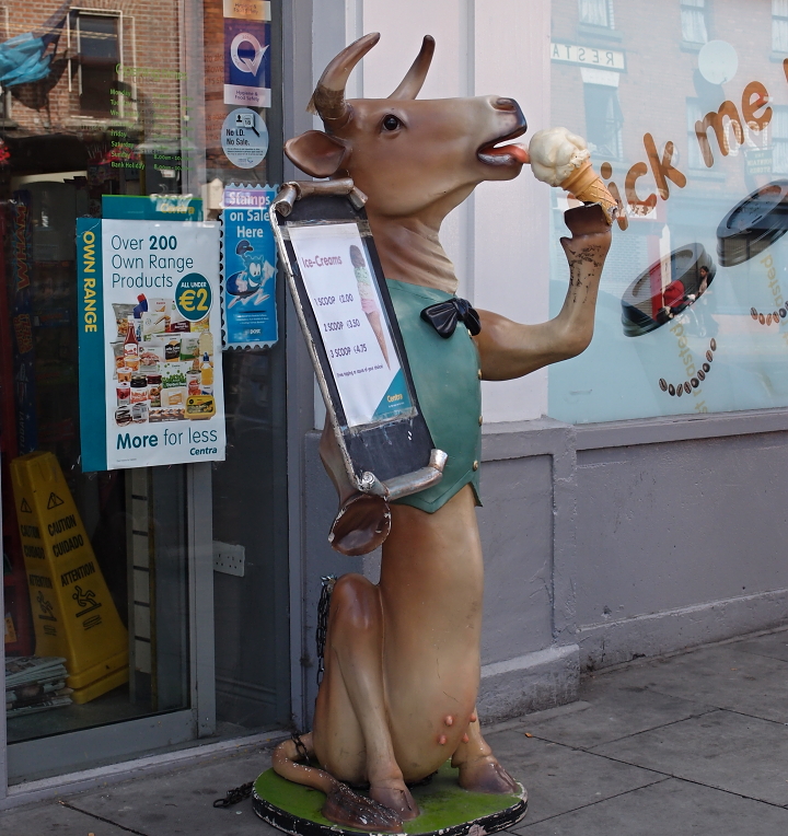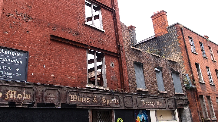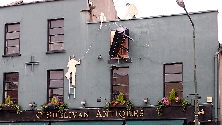 Zaplatili jsme, protáhli se mezi kuřáky na chodníku před hospodou a všelijakými postranními ulicemi jsme se vraceli do středu Dublinu. Bylo tam k vidění ledacos: mrtvola na hřbitově, piáno na fasádě, poněkud ošuntělejší domy.