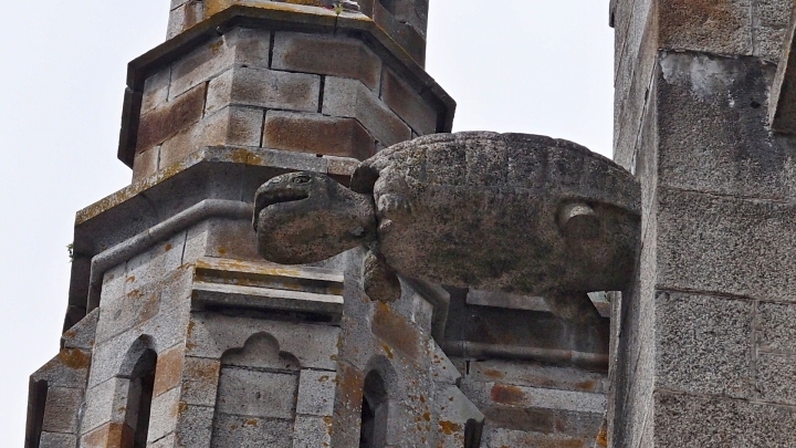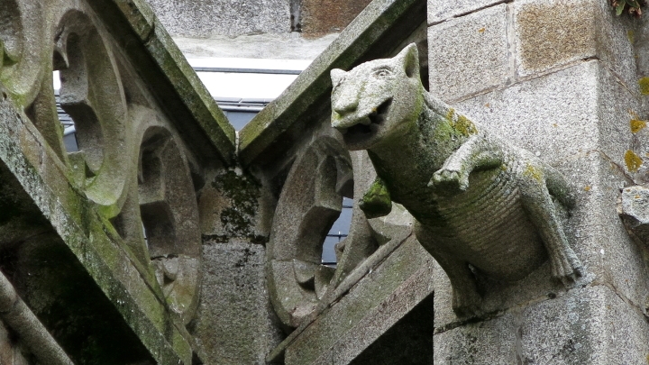 Pochodovali jsme z kopce kolem radnice, před kterou stál starobylý kolotoč, až ke katedrále. Ta je ozdobena poněkud nezvyklými chrliči: tu podivné zvíře,