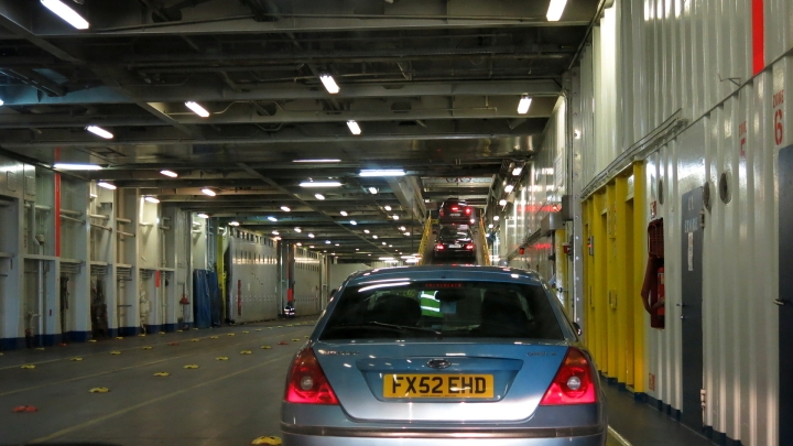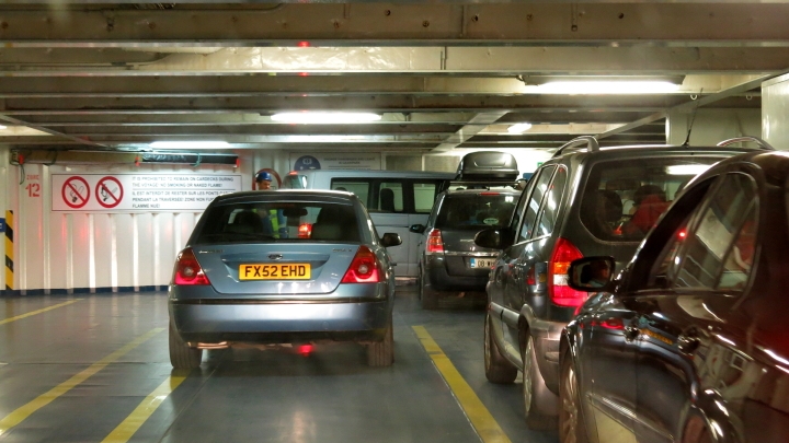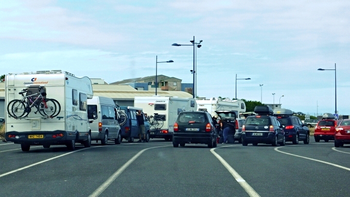 Irish Ferries. Nakonec jsme dojeli přesně na čas. Stavíme se do fronty, která se šine k odbavovací boudě.