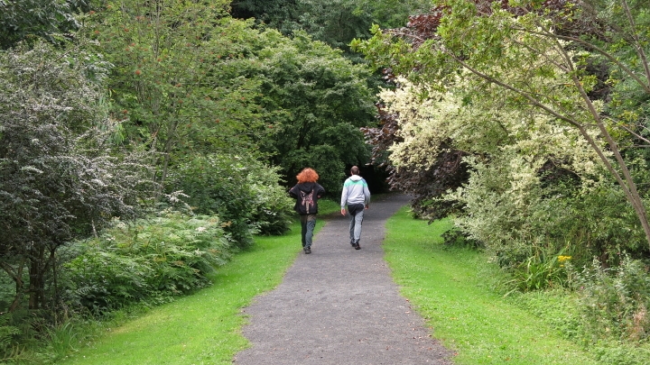 Malou brankou jsme vešli do rozsáhlého areálu. Cesta vedla nejprve romantickým parkem a pak se vyhoupla dřevěnými dvířky na travnaté návrší s několika pozoruhodnými objekty.