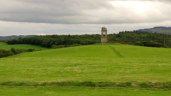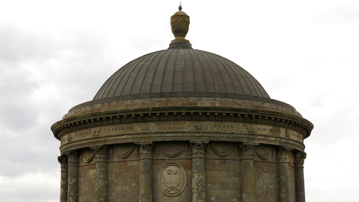 Nápis hlásá, že je to Mussenden Temple, původně knihovna a památník dámy jménem