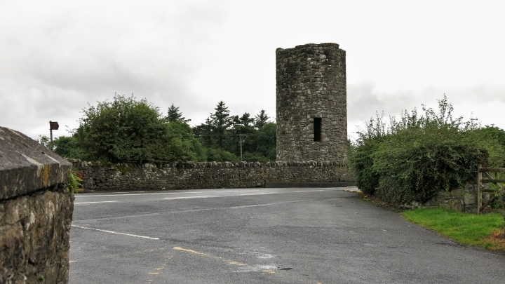Drumcliffu. Silnice prochází surově středem starého kláštera, takže pahýl věže (blesk v roce 1396) zůstal na jedné straně a hřbitov na druhé.