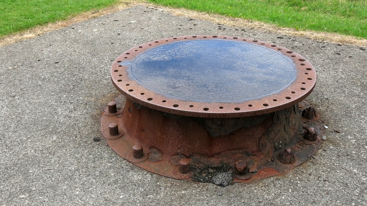 Na břehu pod námi jsou zbytky palebných postavení, použité jako odpočívadlo. Je to řada betonových základů s ocelovými drahami pro natáčení děla nebo