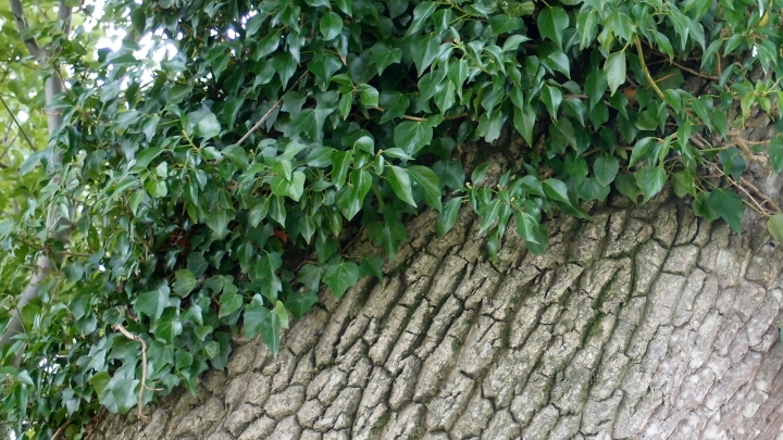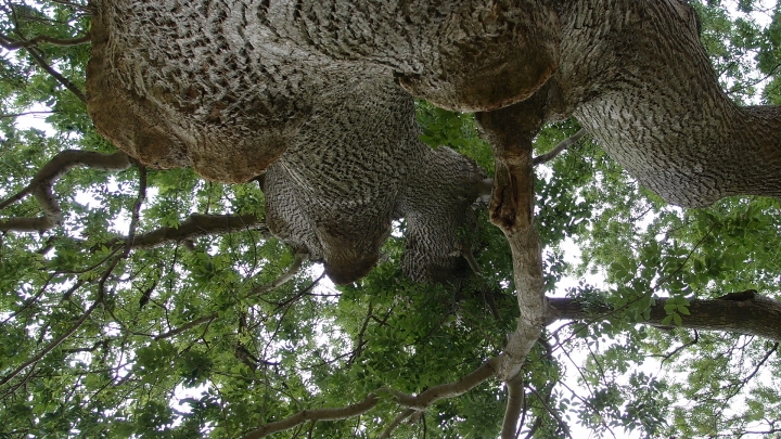 A taky fotila: korunu stromu, kůru, všelijaké listy a větvičku a mě.