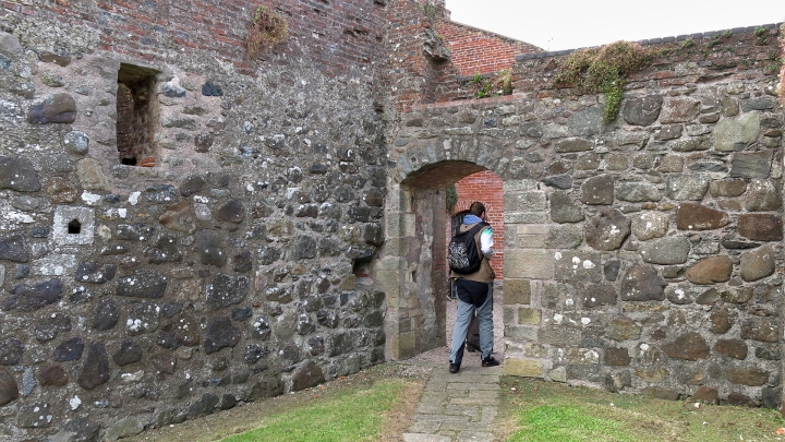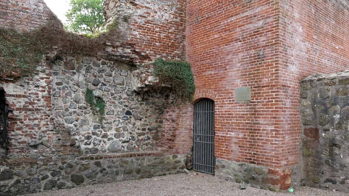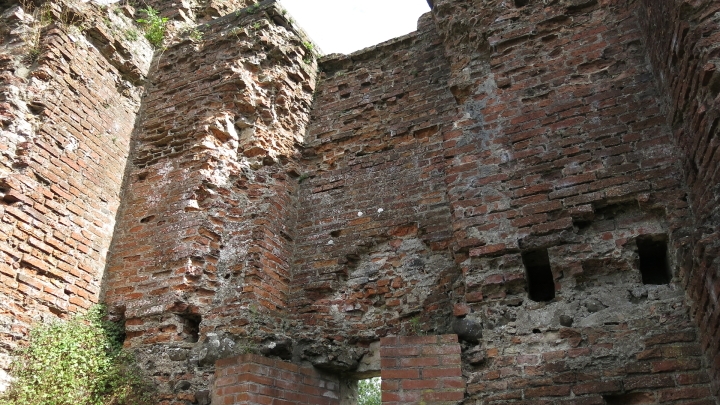 Za hrdým nápisem jsme prošli brankou do zřícenin velice nevelikých. Zbytky opršelého zdiva z kamene a cihel jsou náhle vystřídány novostavbou věže z roku 2002!