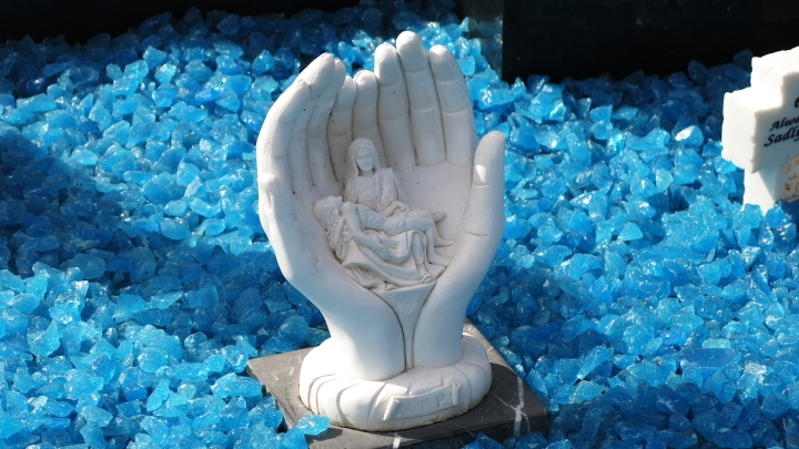 Povrch hrobu je často vysypán barevnou skleněnou drtí a vyzdoben plastikami, patrně od jednotlivých pozůstalých.