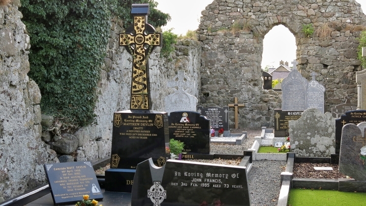 Okolo zbytků kostela jsou opřeny letité náhrobní kameny. Mezi jeho zdmi jsme nalezli krásný kříž na hrobu dalšího z mnoha Devlinů.
