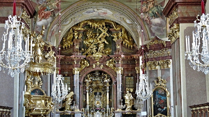 Jakoba Prandtauera z let 1708-1710. Obrovité varhany, vše bohatě zlacené.