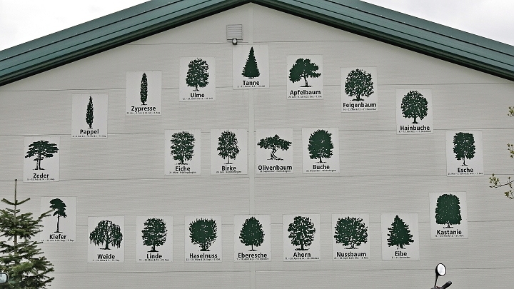 Hned u parkoviště nás přivítala keltská stromová znamení na stěně skladu a reklamní plakát.