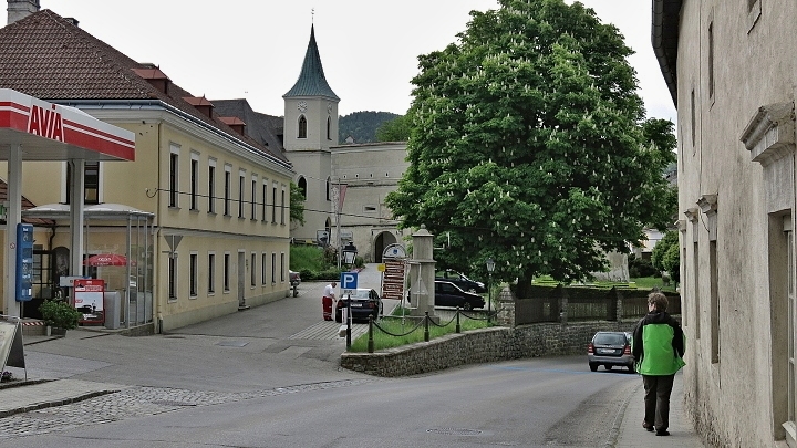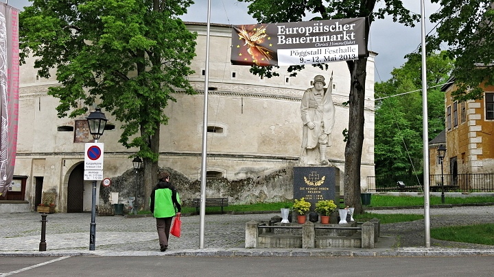 Městečko je prťavé. Při návratu k autu jsme narazili na obrovitou májku. V Rakousku její stavbu financují konkrétní sponzoři, jak vidno z tabulky na kmenu.