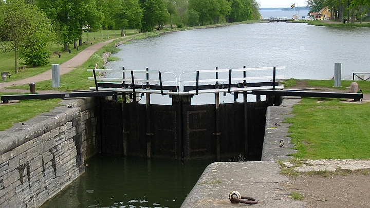 Göta, který umožňuje proplout napříč Švédskem (celkem 614 km) a překonává pěkný výškový rozdíl (skoro 100 metrů) pomocí velkého množství zdymadel. My jsme si prohlédli jednu z nejhustších řad těchto zařízení u jezera