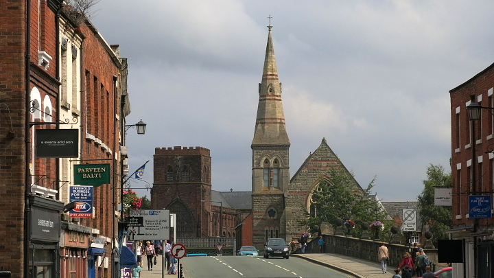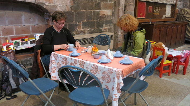 Shrewsbury. Hned vedle parkoviště je klášterní kostel, kde zrovna měli akci! Prodávali darované knihy, zisk šel na dobročinné účely. Pořadatelské dámy připravovaly občerstvení.